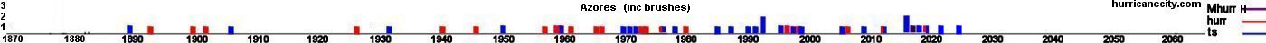 - 2019, October 2nd Hurricane Lorenzo passes just northwest of the western most Azores with 95 mph winds while moving very fast to the northeast. Corvo Island reported sustained 74 mph gusts to 101 mph moderate damage. Hit map | Sinking of ship to northwest | NHC report