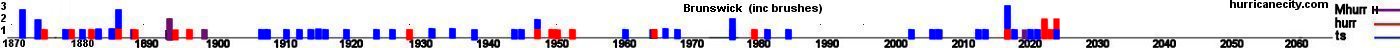 - 1896 September 29th a category 2 115 mph passes over while moving northeast. Winds caused very heavy damage in the area. Hit map