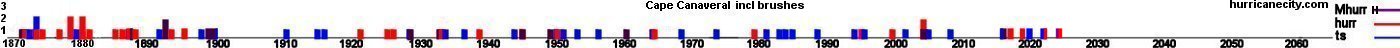 Cape Canaveral Brushed or hit every 1.91 yearsAverage years between direct hurricane hits. (hurricane force winds for at least a few hours)