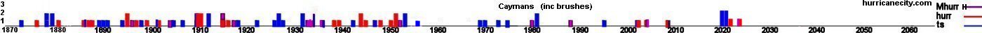- 2024 November 5th Hurricane Rafael just west of Cayman Brac by 23 miles with 75 mph winds while moving northwest