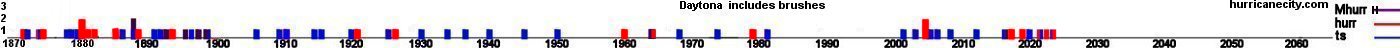 - 2016, October 7th Hurricane Matthew passes just east by 27 miles with 120 mph winds while moving north-northwest. Three killed in Volusia county an 89-year-old Volusia man was electrocuted and burned after power lines fell on his home, a 63-year-old woman was feeding her animals when a tree fell on her and a 9-year-old boy in Volusia died from carbon monoxide poisoning after a generator was turned on in his home. Radar animation (Brian McNoldy, Univ. of Miami, Rosenstiel School) | Best models | Matthew timeline | USGS surge info