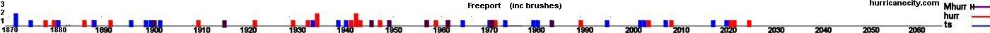 - 2021 September 14th Hurricane Nicolas makes landfall just south by 20 miles with 75 mph winds while moving north. At Freeport Harbor, a TCOON station reported a sustained wind of 57 kt and a gust to 74 kt. Radar animation (Brian McNoldy, Univ. of Miami, Rosenstiel School) hit map | NHC Report