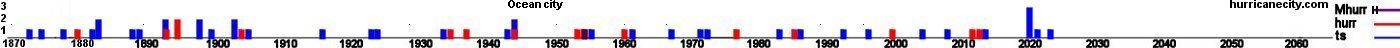 - 1936 September 18th, a hurricane brushes just east by 38 miles with 95 mph winds while recurving out to sea from the south, Boardwalk partially destroyed.