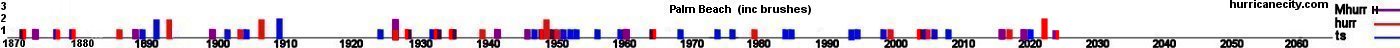 Palm Beach Brushed or hit every 1.99 yearsAverage years between direct hurricane hits. (hurricane force winds for a few hours)