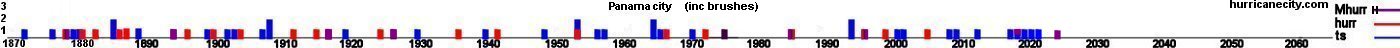 Panama city Brushed or hit every 2.32 yearsAverage years between direct hurricane hits. (hurricane force wind gusts for a few hours)