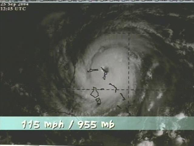 - 2004, September 25th Hurricane Jeanne eye passes over north part of Island. 2nd hit in 3 weeks as Jeanne hits with 115 mph winds. Treasure Cay International airport. The facility has been extensively damaged by Hurricanes Jeanne and Frances. Flood waters rose to more than six feet in some areas and roofs were blown off of houses. Part of roof at emergency operations center collapsed causing minor injuries to occupants. Sat image | Models 3 days before hitting