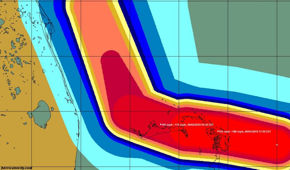 - 2019, September 1st, Hurricane Dorian hits from the east with 185 mph winds ravaging the area for over 24 hrs. The Health Minister in the Bahamas estimated that more than 200 people lost their lives in Dorian. The Bahamas Weather Service estimated the total at 74, with 63 these occurring in Abaco The Bahamas Weather Service also reported that there were 245 people missing at the time of their report 912 mb. (per NHC report) Our coverage as it happened | Radar animation (Brian McNoldy, Univ. of Miami, Rosenstiel School) | Final average model error | Dorian wind swath | Wayne Neely's book on Dorian | NHC report