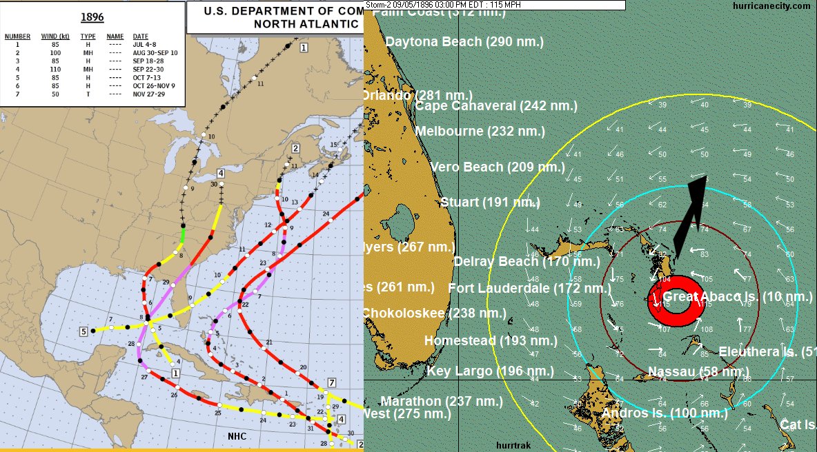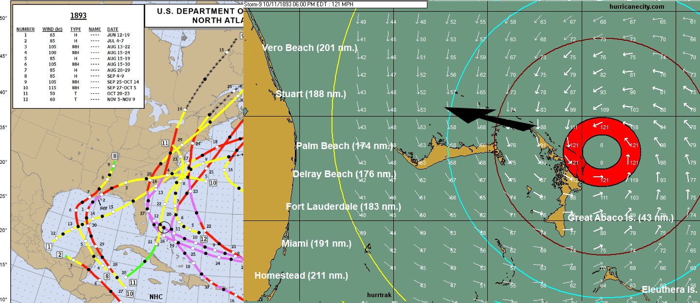 - 1883 105 mph September 9th from the south 106 killed in Bahamas passed just west of here.