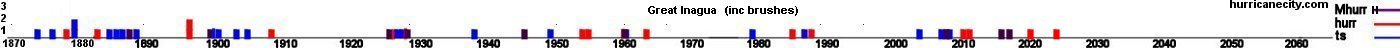 - 2017 September 8th Hurricane Irma hits just north by 30 miles and hits little Inagua Island with 155 mph winds while moving west. Morton Salt facory damaged. Best track data | NHC report