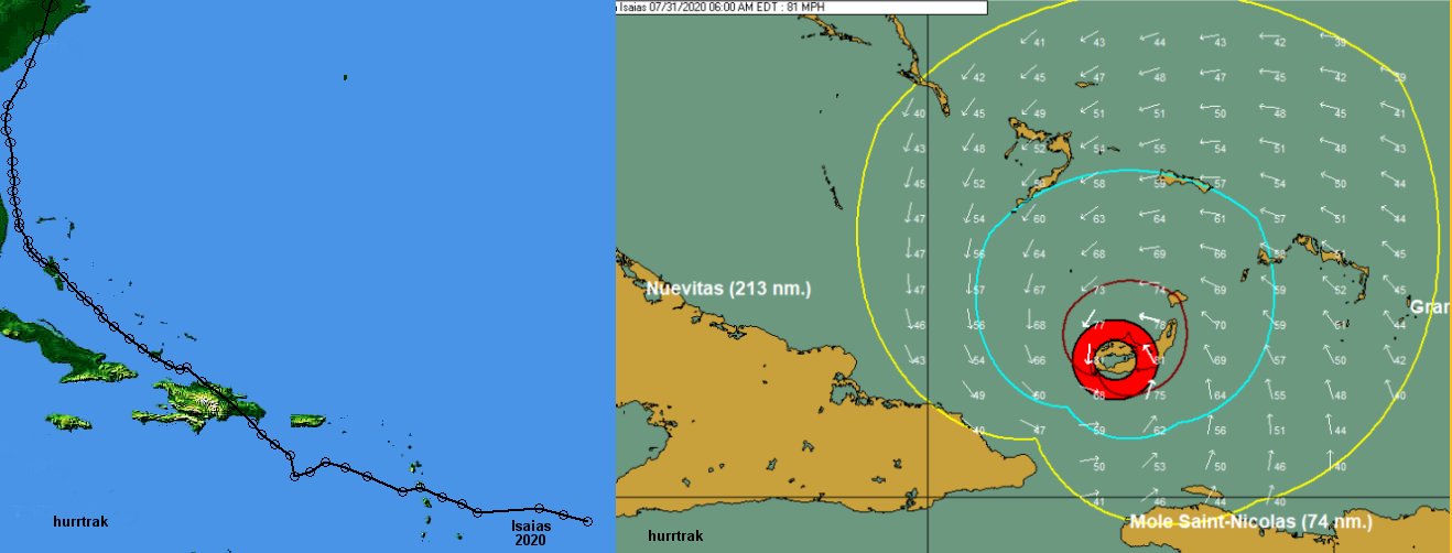 - 2020 July 31st Hurricane Isaias passes directly over while moving northwest with 80 mph winds. Radar animation (Brian McNoldy, Univ. of Miami, Rosenstiel School) Hit map