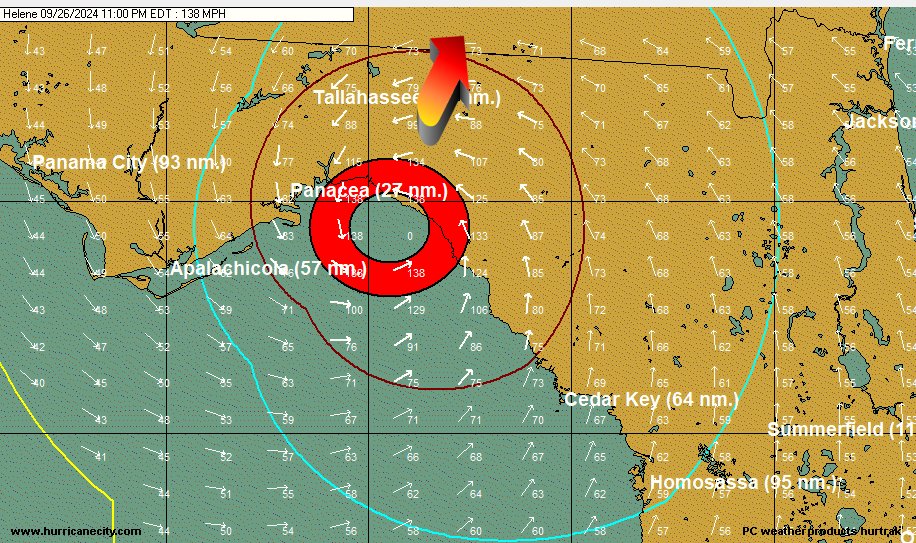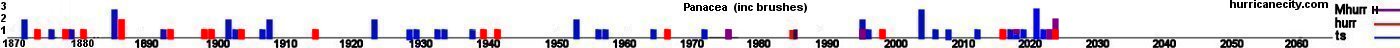 - 2024 Major Hurricane Helene hits just east by 27 miles with 140 mph winds while moving north-northeast. Four foot tidal surge reported in this general area. NHC Report | Hit map | Our coverage from Tallahassee
